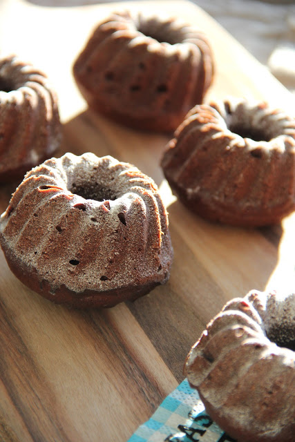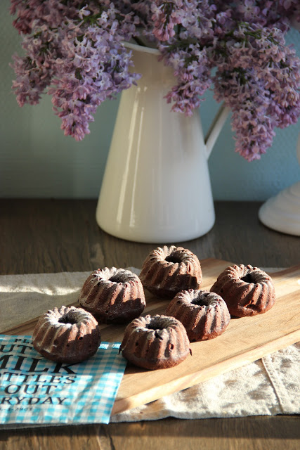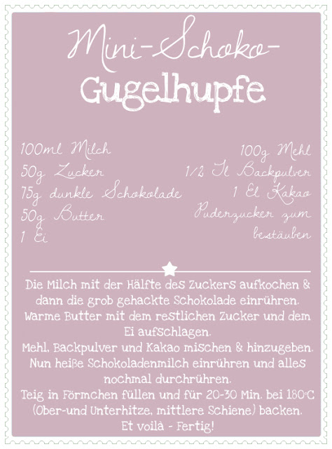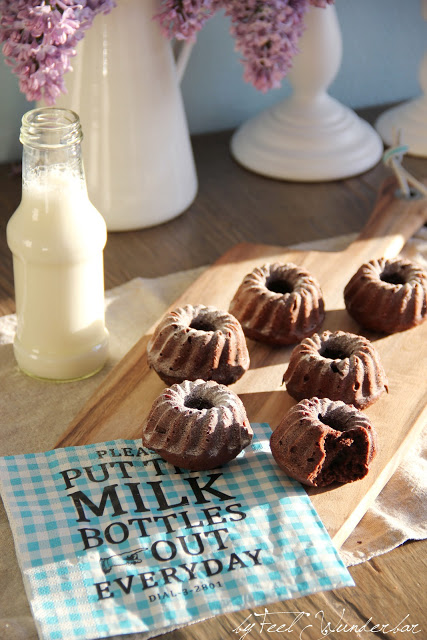 Heute ist Sonntag meine Lieben … und noch dazu der Schönste diesen Jahres – bei herrlichen 26°C tippe ich euch diesen Post, gekleidet in ein ein Flatteroberteil und einen kurzen Rock. Der erste SOMMERTAG … Juhu! Und um ihn noch fabulöser zu machen, habe ich … ein SONNTAGSSÜß für euch: Mini Schoko Gugelhupf – Köstlich und mit 2 Bissen verdrückt :)