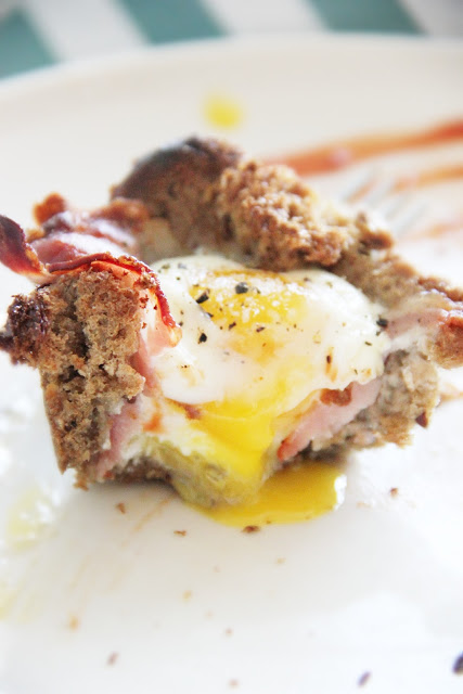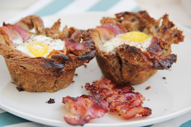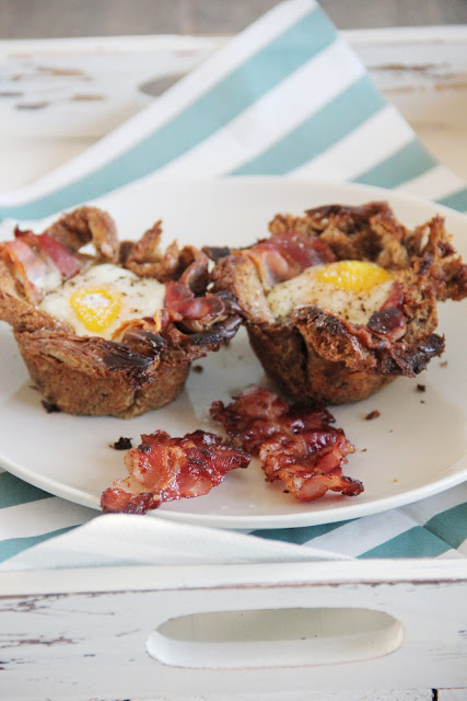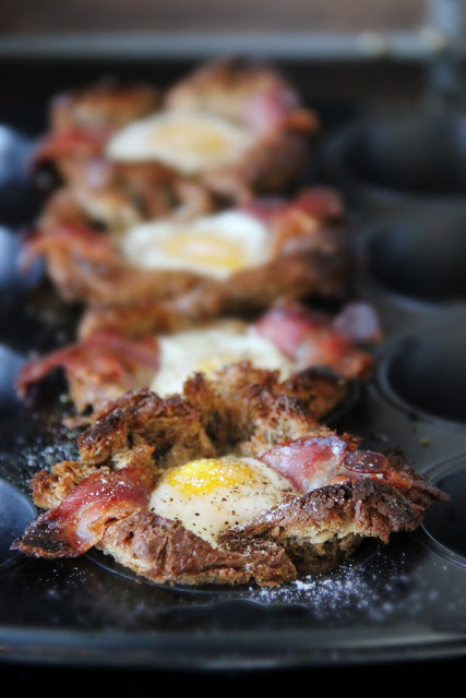 Was passiert, wenn man eine stinknormale Scheibe Toast-Brot in ein Muffin-Blech stopft, eine Scheibe Bacon hinein legt und dann ein Ei darauf gibt?