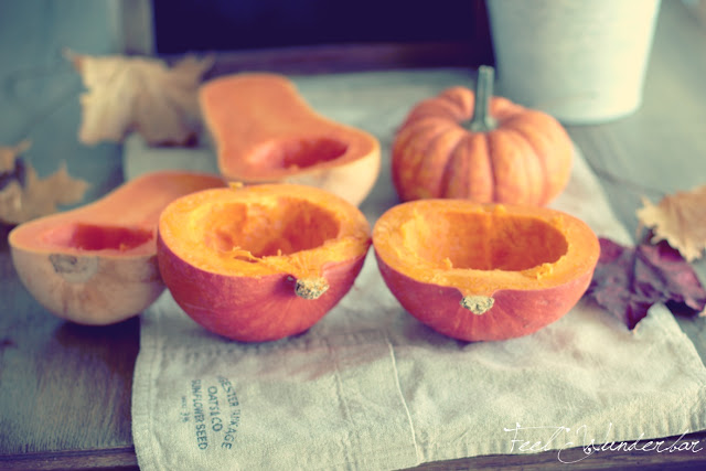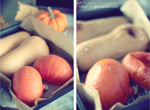 Das Ganze wird dann bei 160°C für ungefähr eine 1h gebacken, bis der Kürbis sich ganz leicht heraus löffeln lässt.