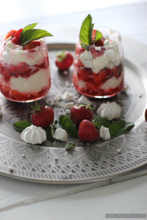Erdbeeren – Baiser grob zerbröseln – Sahne – Erdbeeren – Baiser – Sahne …