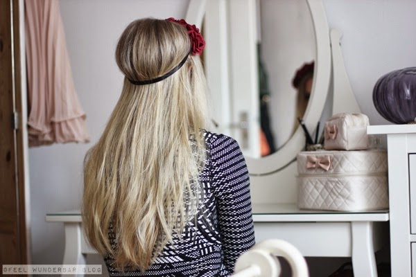 Dann legen wir mal los. Heute möchte ich euch nämlich zeigen, wie man eine ganz tolle Frisur binnen weniger Minuten zaubert, die nach viel Arbeit aussieht, aber super easy peasy von der Hand geht! Alles nur mit Hilfe eines Haarbandes :)