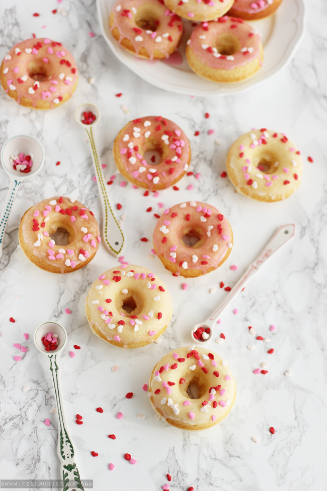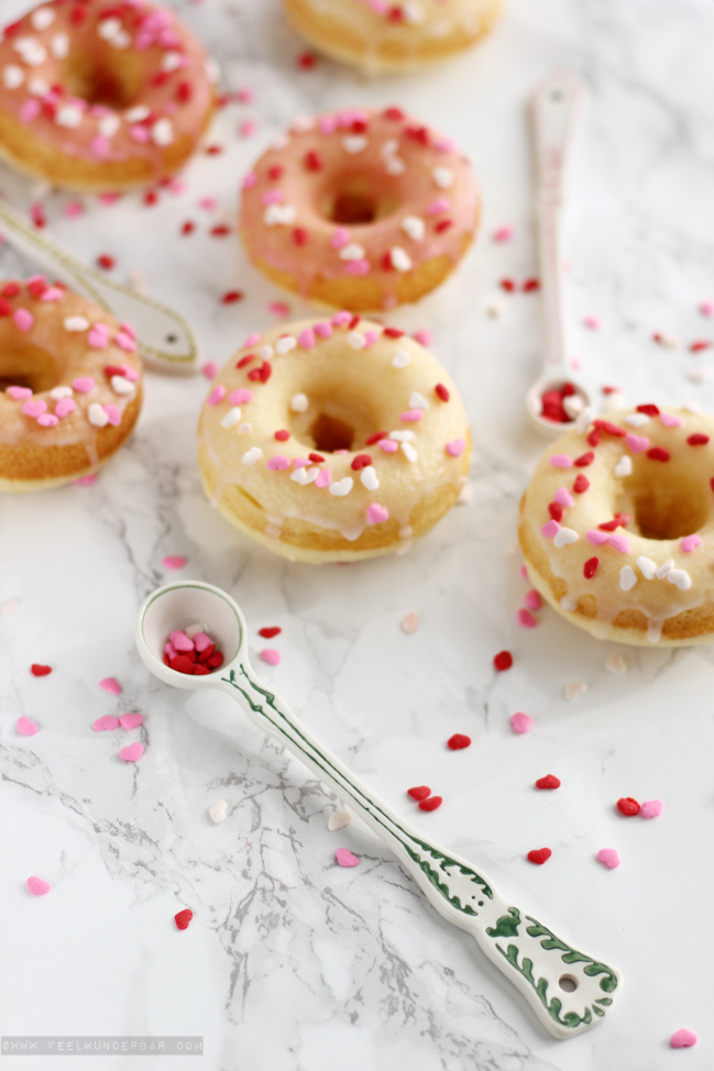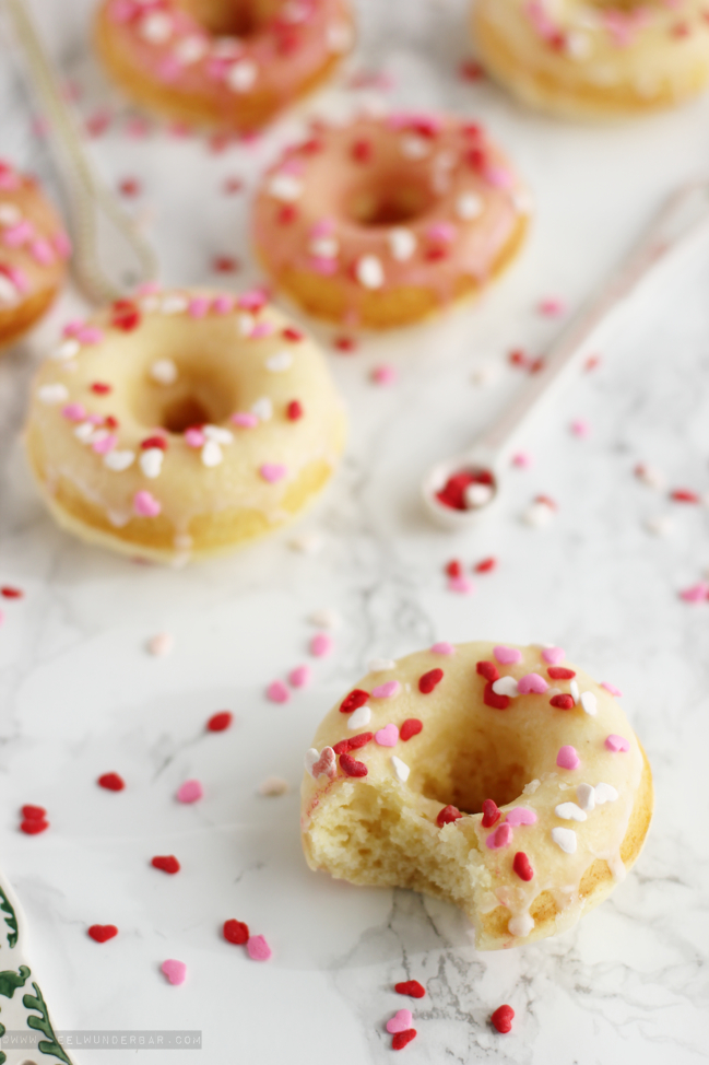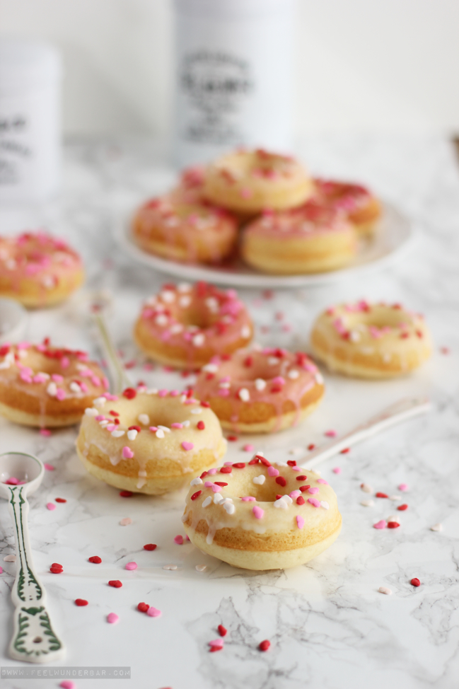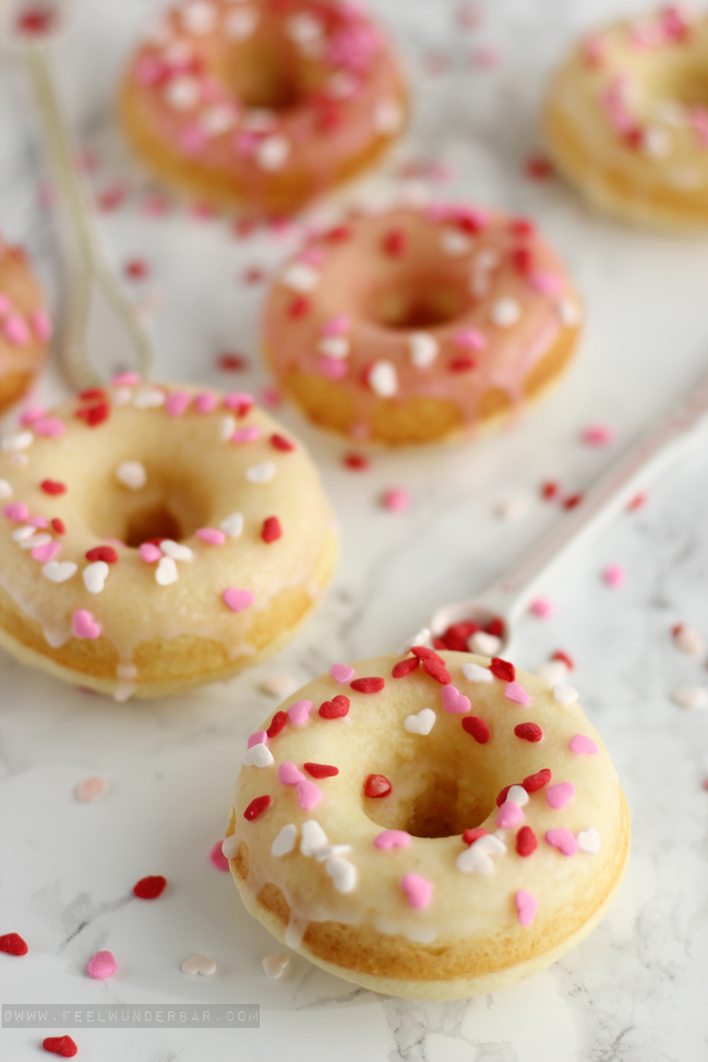 Be my Valentine… ?! Na… seid ihr schon im Turteltauben-Fieber oder geht ihr die Sache ganz “cool like a cucumber” an? Ob nun Valentinstagsliebhaber oder freiwilliger Single aus Prinzip, heute habe ich eine zuckersüße Leckerei für euch: Valentins-Vanille-Donuts mit ganz viel Liebe! :) Passend zum Valentinstag musste ich natürlich mit Zuckerherz-Deko nur so um mich schmeißen! Natürlich könnt ihr das Rezept auch gerne nach euren Vorlieben abändern, z.B. lieber mit Schokostreuseln dekorieren oder sogar ein wenig Schokolade unter den Teig mischen. Eurer Kreativität sind da keine Grenzen gesetzt. Schließlich mag es nicht jeder über-kitschig mit Herz-Bestreuung (aber mal ein’s schadet es auch nicht ;)).