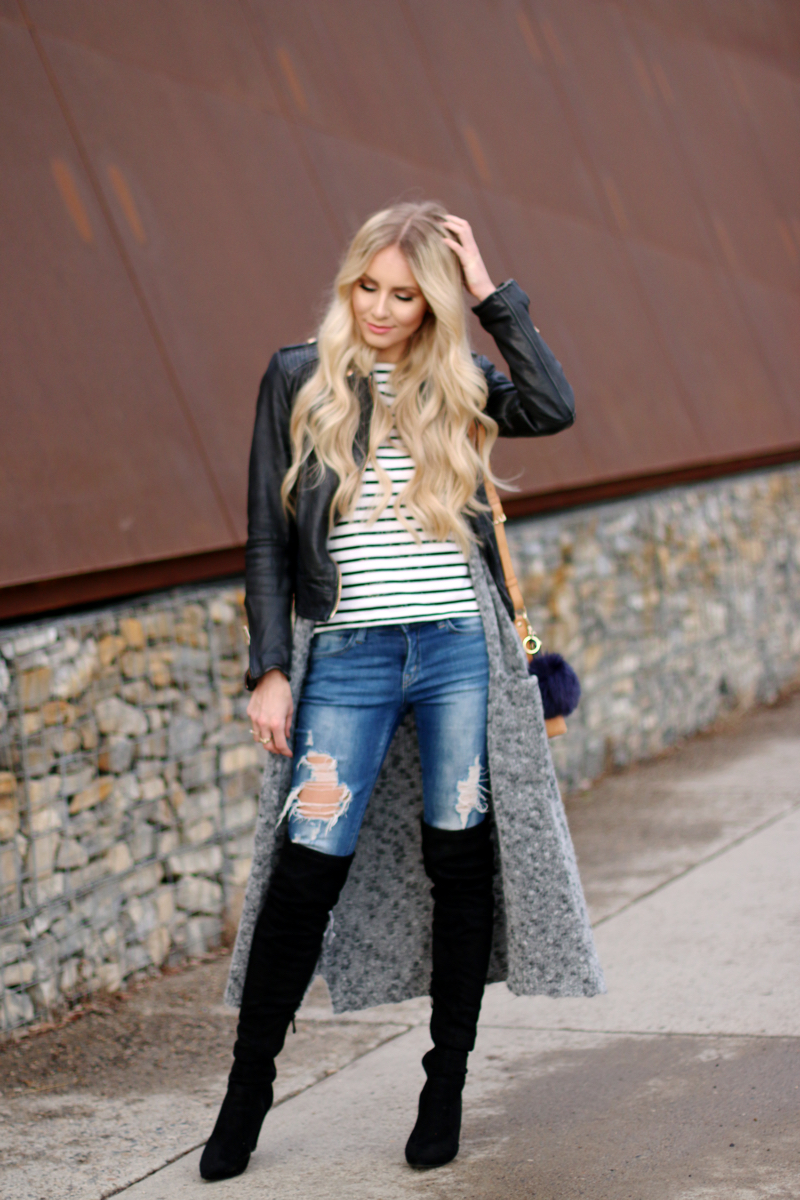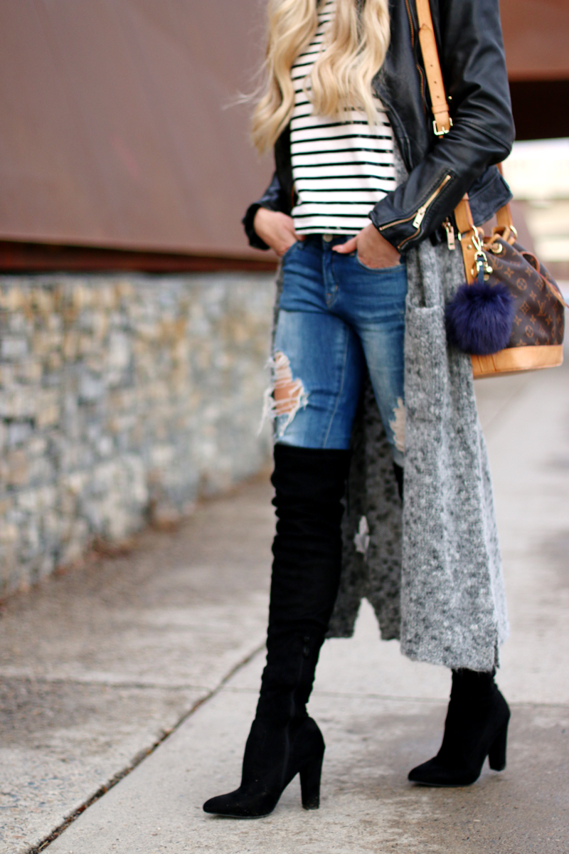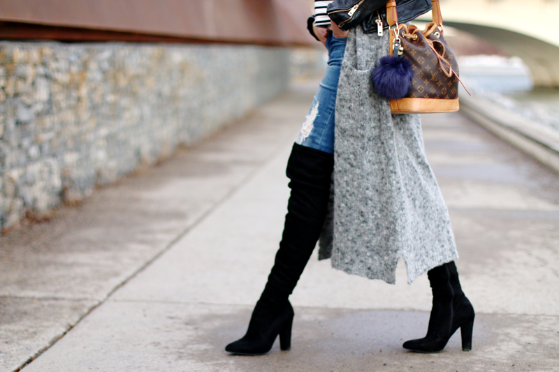 Das Hauptproblem, beim Styling von Overknees, ist meiner Meinung nach, dass man schnell billig aussehen kann, bzw. recht übertrieben. Deshalb kombiniere ich die Cult Boots gerne relativ casual & schlicht, in diesem Fall sorgt der lange Kuschel-Cardigan für eine Portion Alltagstauglichkeit und entschärft die Länge der Overknees ein wenig. Auch das Streifen-Shirt ist eher lässig und stellt einen schönen Kontrast zu den Stiefeln her.