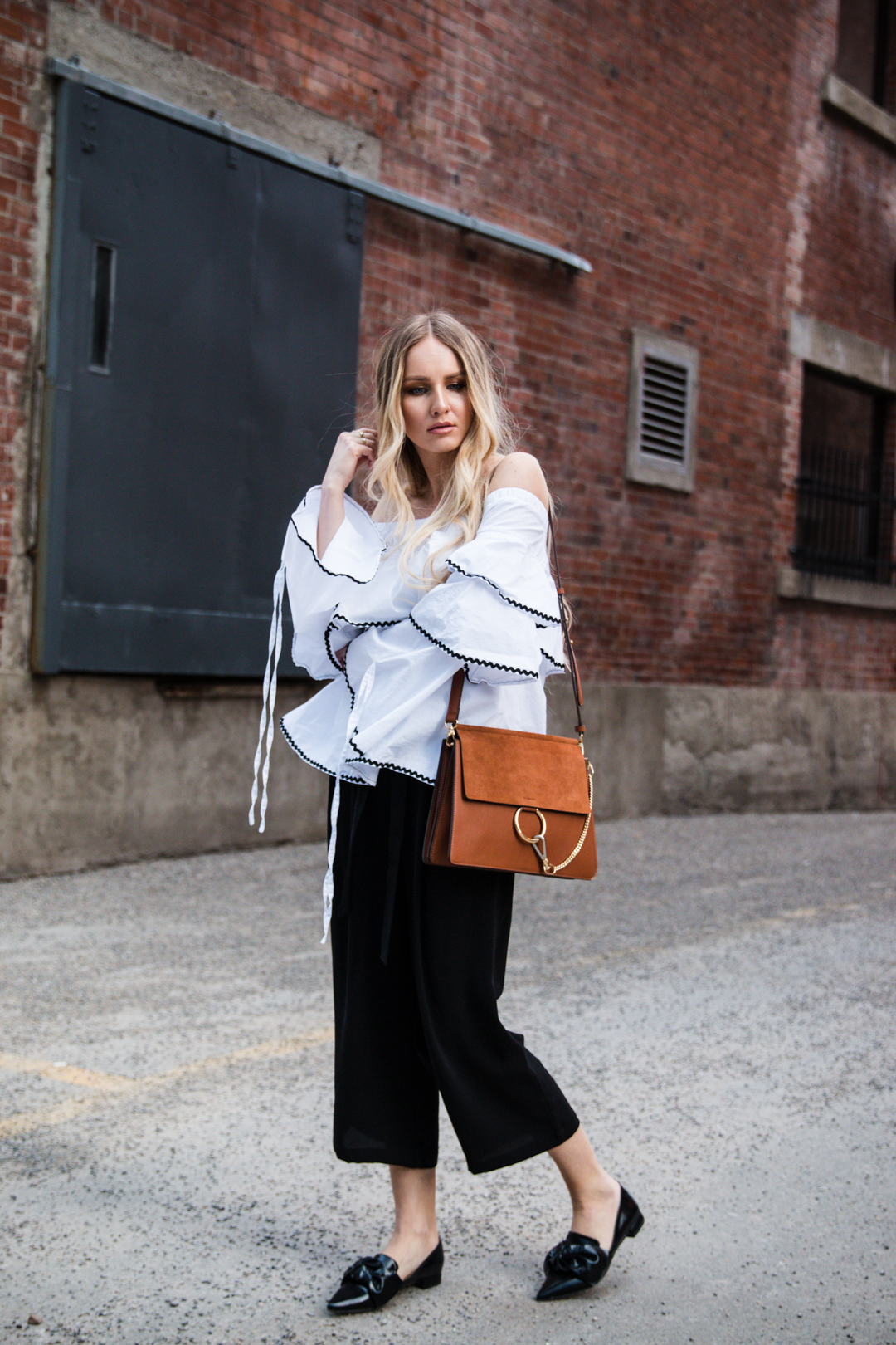 Off Shoulder Top Zara Culottes Chloe Bag Loafers Beige Coat-11