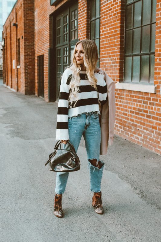 Yara Striped Sweater Outfit Zara Ripped Mom Jeans Casual Tamaris velvet booties-7
