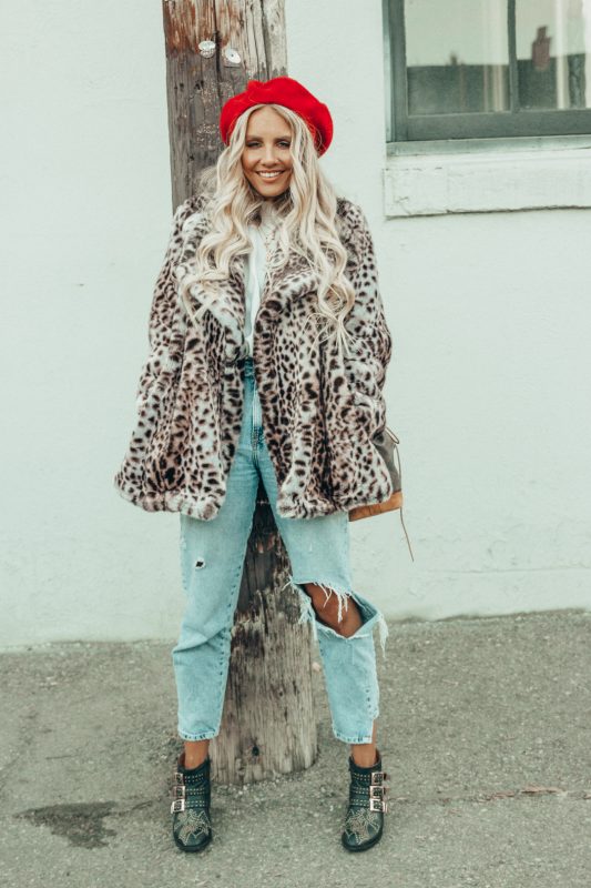 Outfit Zara Leopard Coat Mom Jeans Red Beret-3
